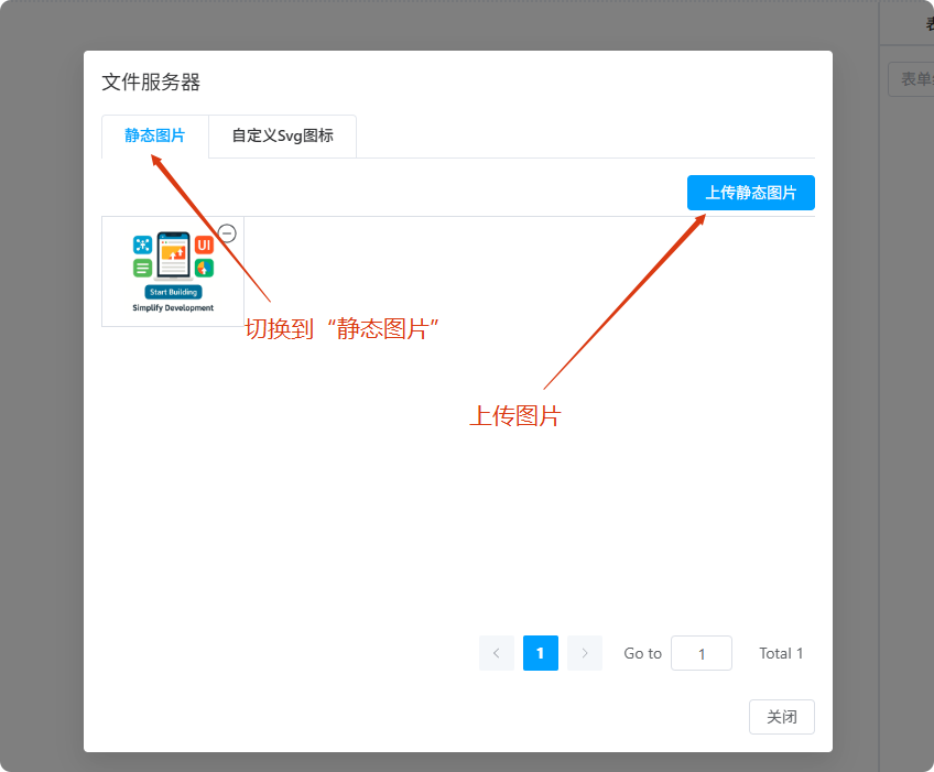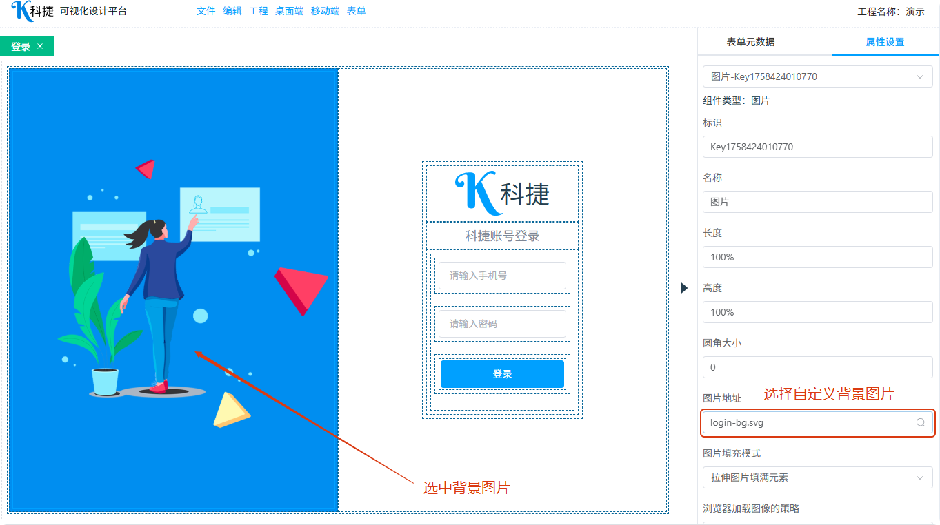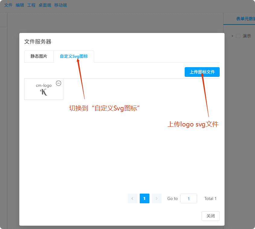 平台工具栏 -> 工程 -> 文件服务器 打开配置界面,上传自定义背景图片和 logo svg 文件