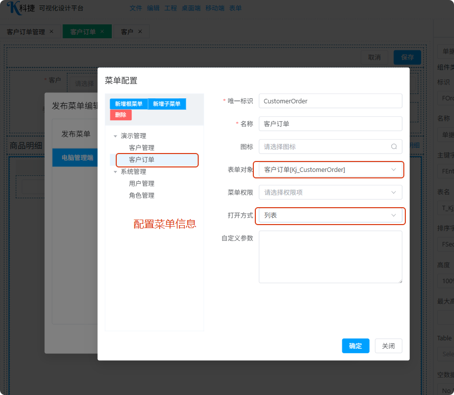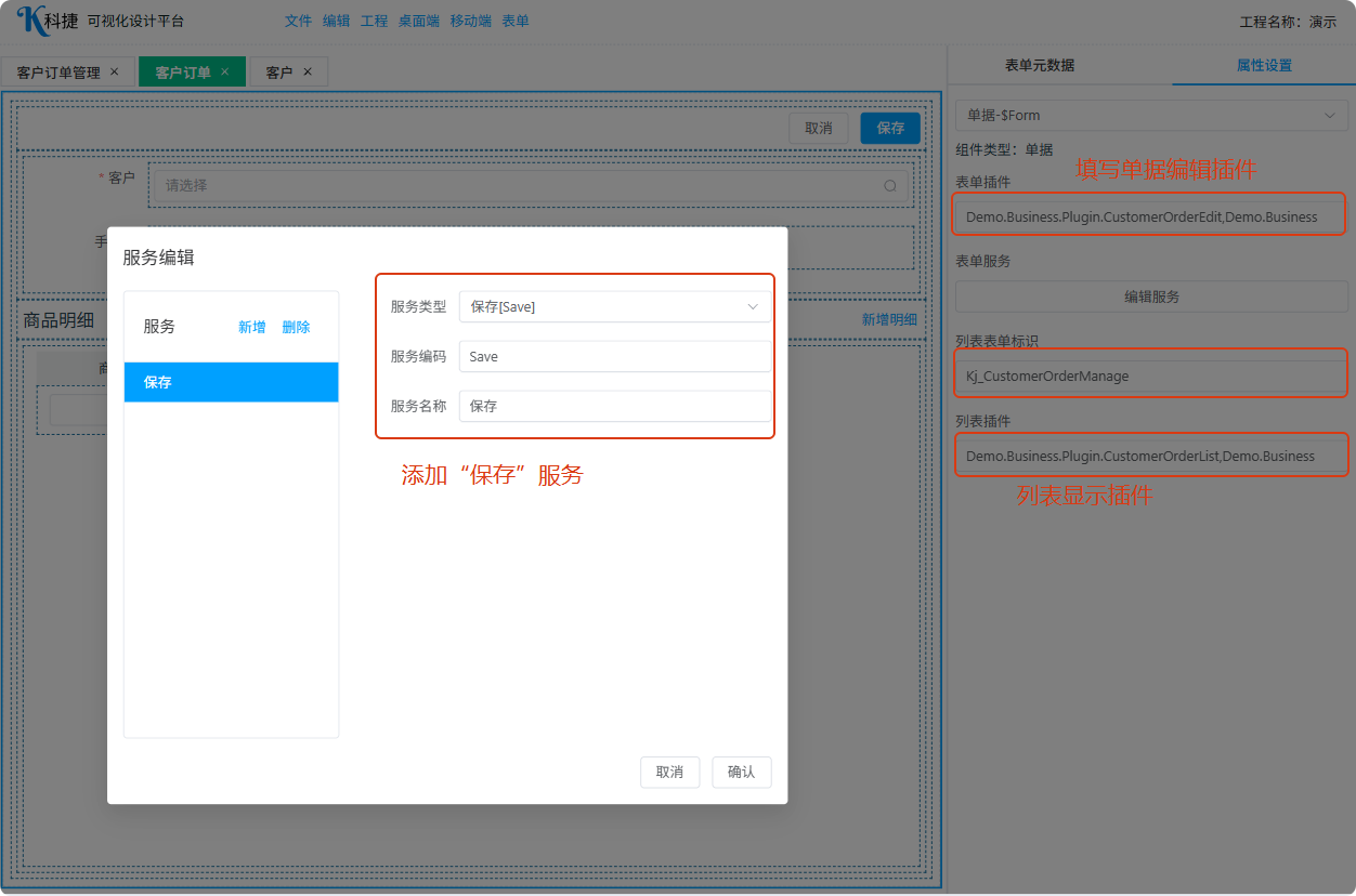 打开Kj_CustomerOrder单据表单,配置插件信息及列表显示表单