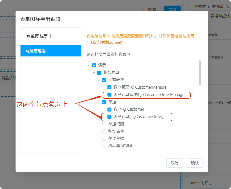 平台工具栏 -> 工程 -> 导出图标 打开配置界面,勾选新增的两个表单