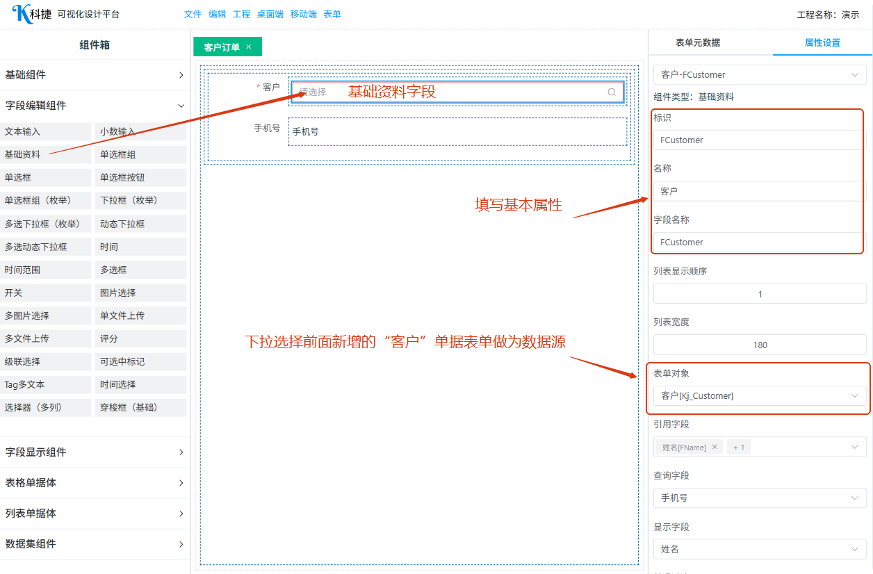 新建一张“客户订单”的单据表单,包含“客户”相关信息和订单明细信息
