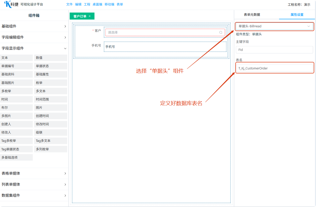 添加表格单据,设置单据头表名